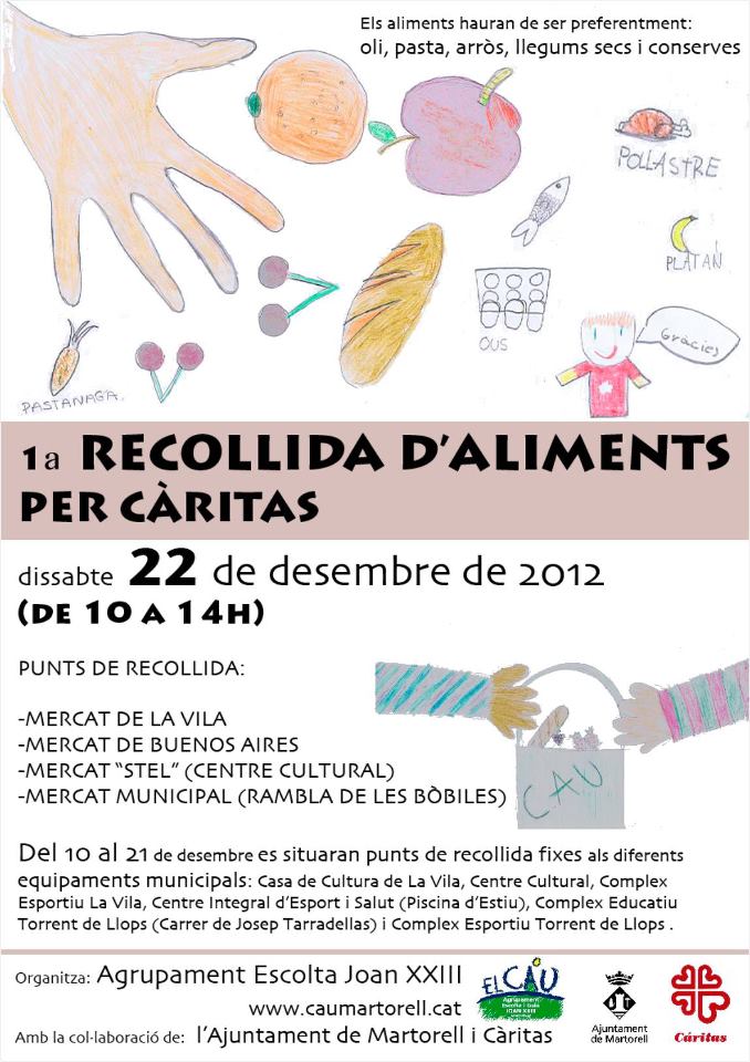 L’entitat de Càritas de Martorell treballa amb col·laboració dels serveis socials municipals i dóna acollida i suport a moltes persones que estan vivint moments difícils. Degut la delicada situació econòmica per la que estem passant, el nombre de persones que recorren a l'entitat de Càritas per rebre una bossa de menjar setmanal està augmentant notablement. Per aquest motiu, l'entitat ha d'atendre a un gran nombre d'usuaris i alguns aliments han hagut de quedar en un segon pla . Des de l’Agrupament Escolta Joan XXIII voldríem aportar el nostre granet de sorra podent recollir aliments bàsics com l'oli, la pasta, els llegums secs, l'arròs, les conserves i d'altres aliments que no es puguin fer malbé.
